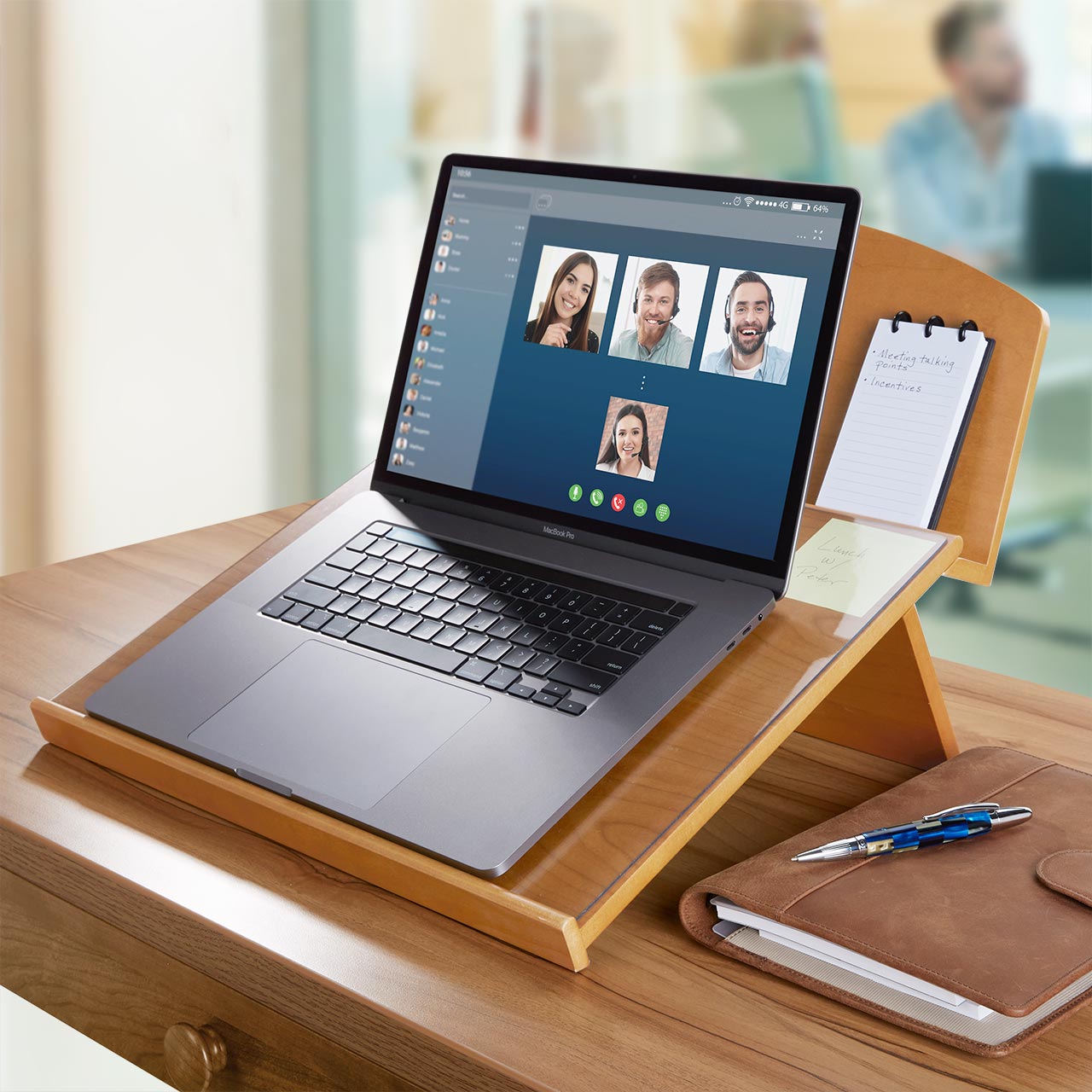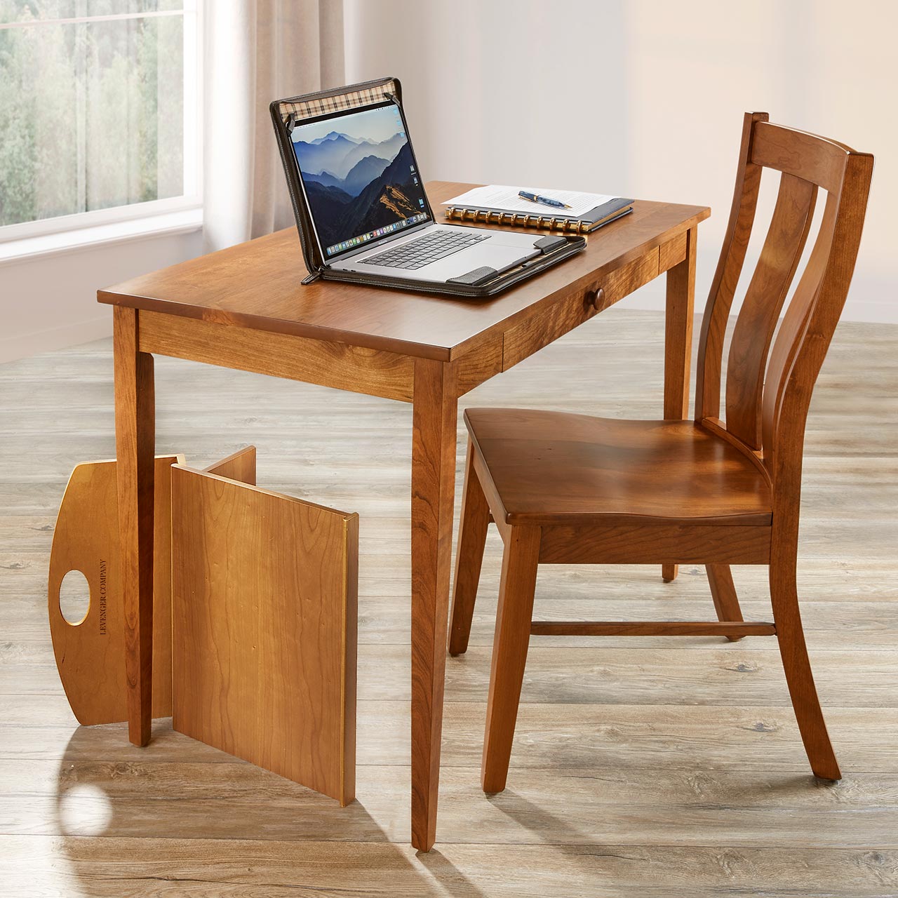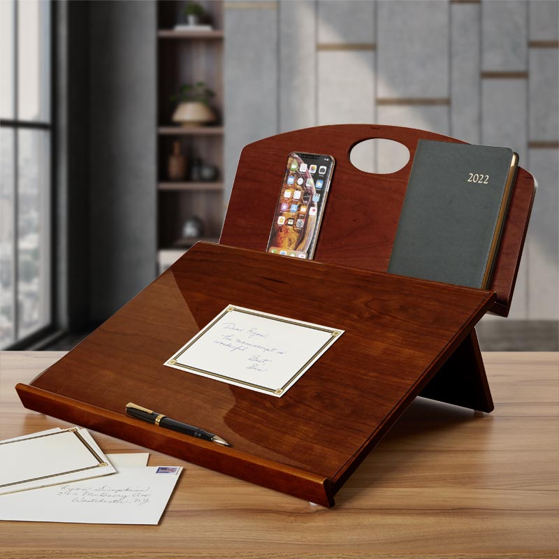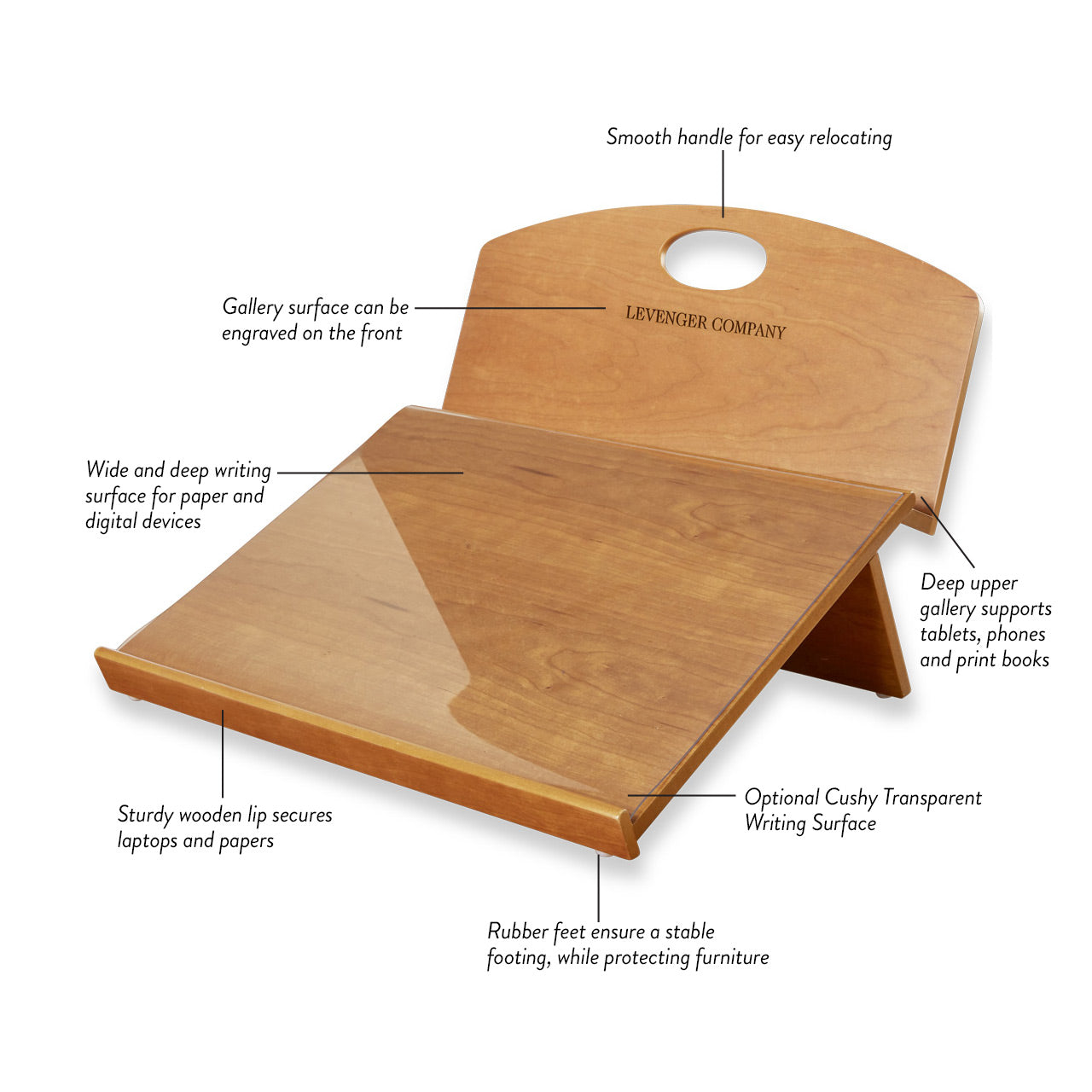 Enjoy the Editor’s Desk’s wide and deep writing surface whether taking notes on paper or typing on a keyboard—or both at the same time. Many customers have told us their handwriting improves. The upper gallery elevates your tablet or phone for comfortable teleconferencing or watching a video, leaving your writing surface open for taking notes. Once you experience the comfort and productivity of a Levenger Editor’s Desk, you may never want to settle for a flat desk again. (But if you do need to move your Editor’s Desk, at less than 7 lbs, it’s easy to lift it off and store it on its side, compactly, beside your desk.)